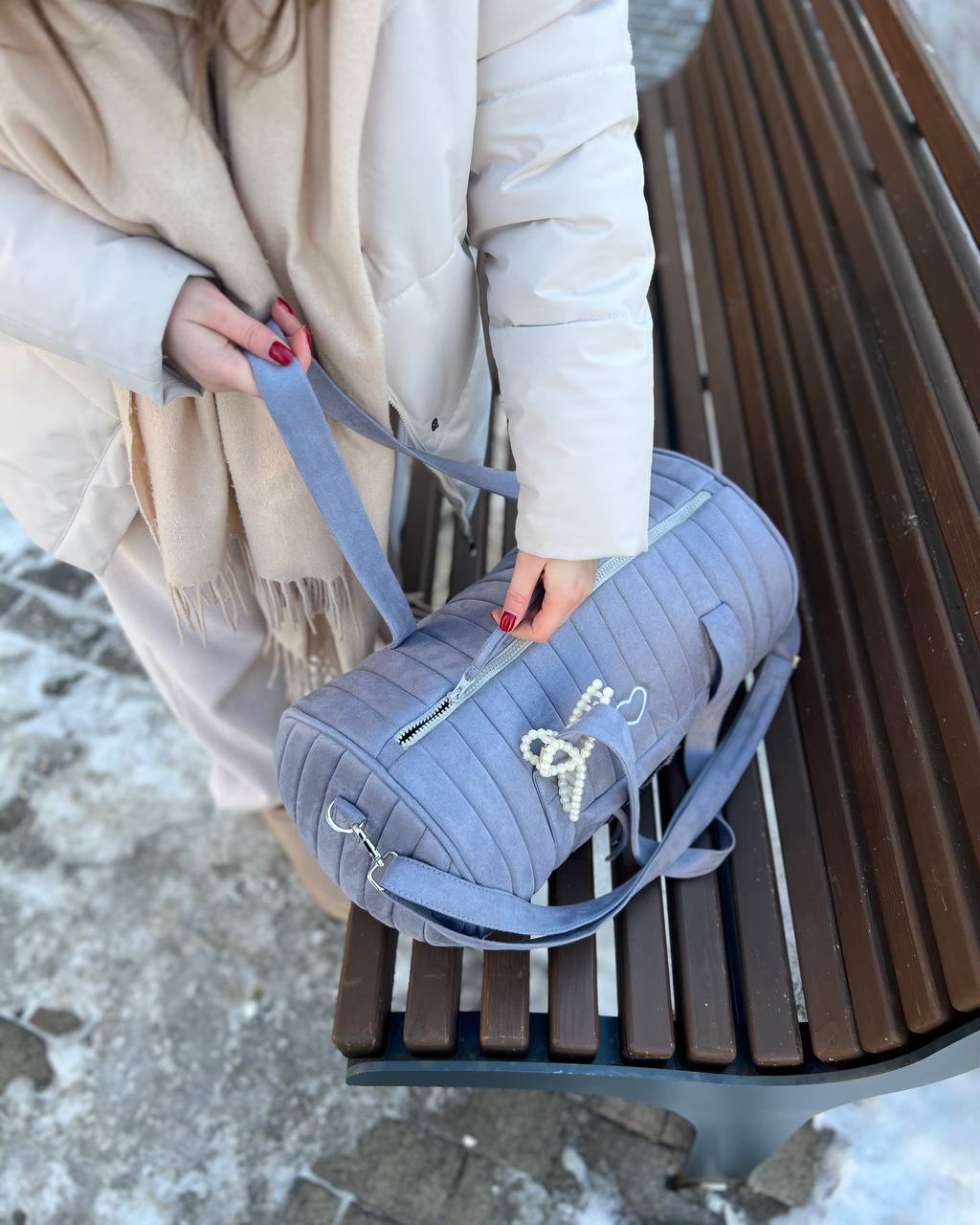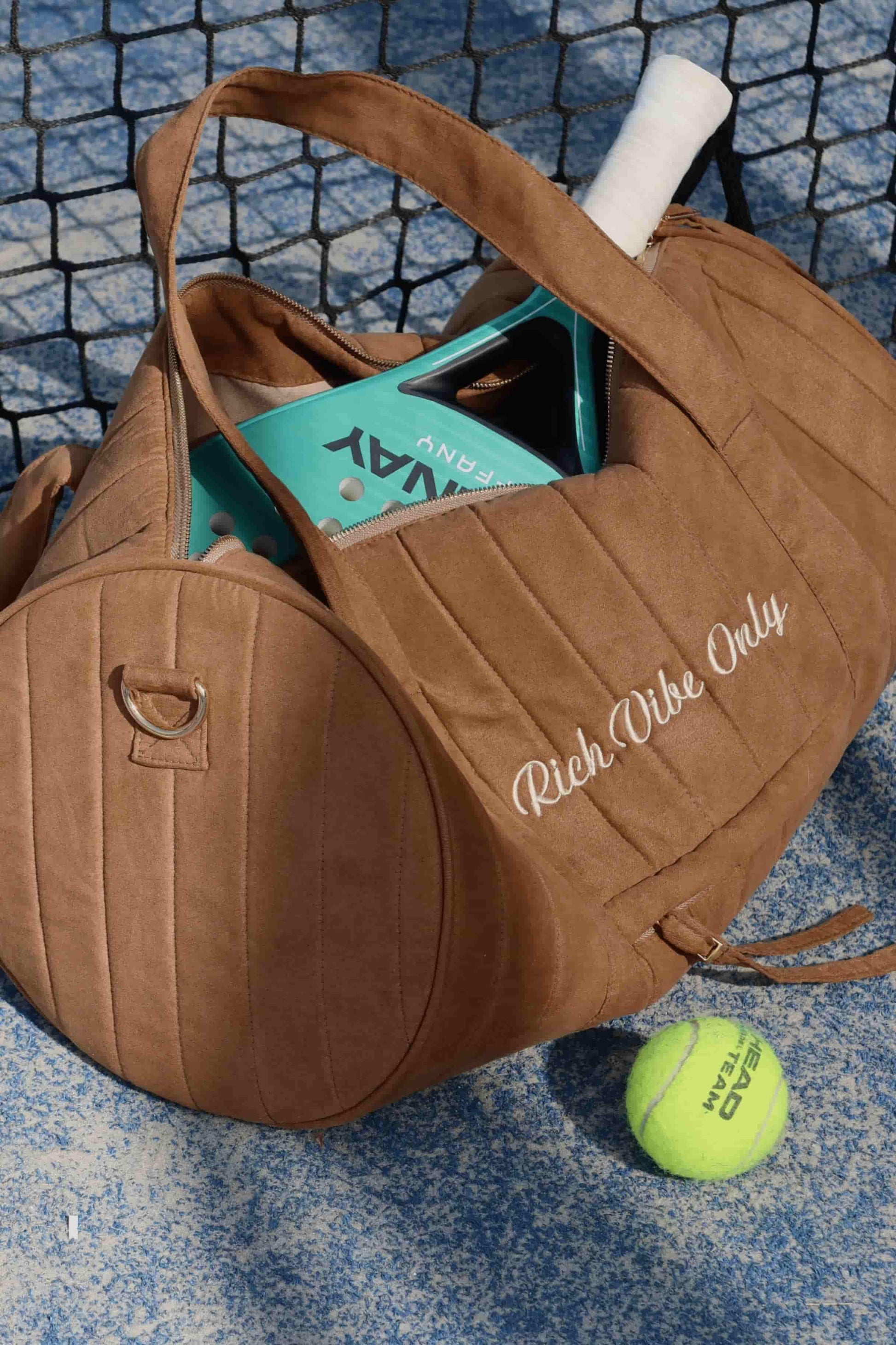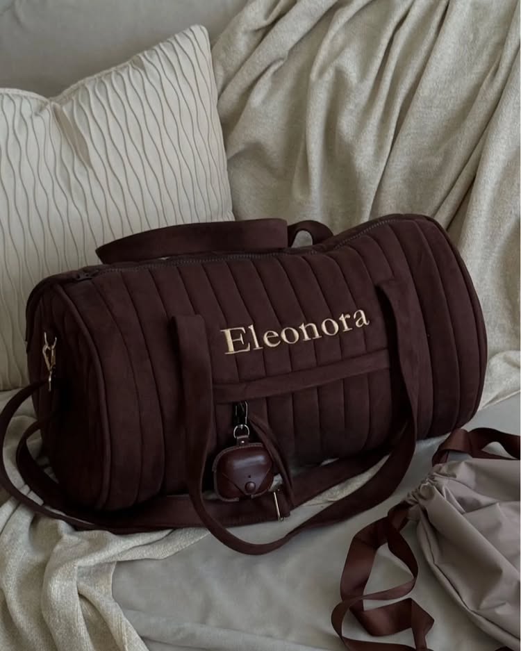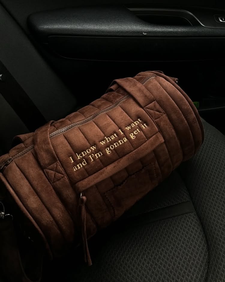 Made from vegan suede with a waterproof lining, it features two inner pockets and one outer pocket for organization.