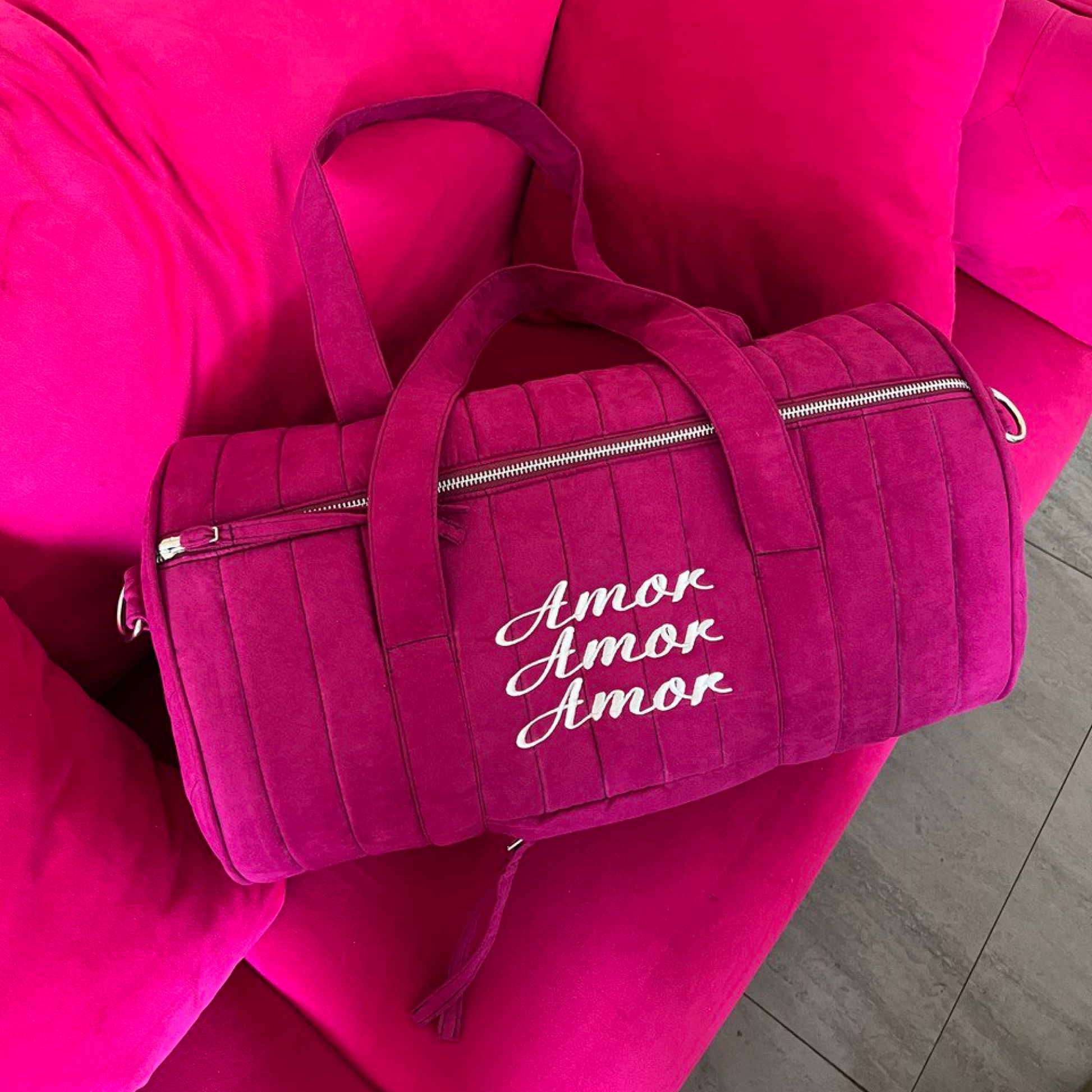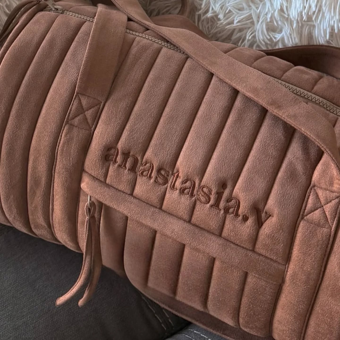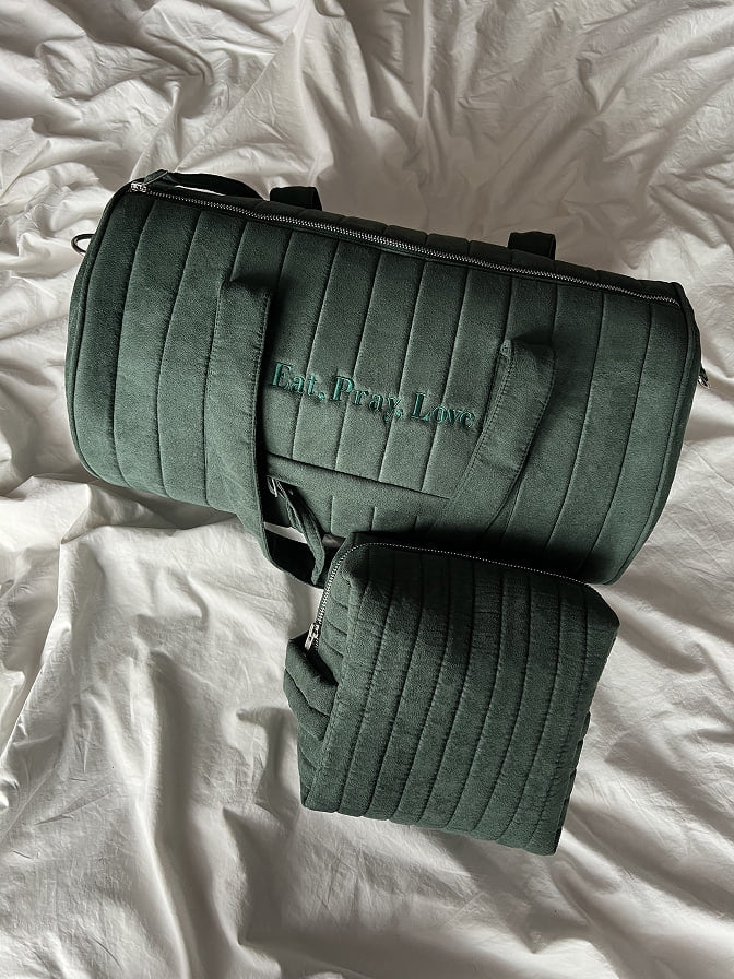 Made from vegan suede with a waterproof lining, it features two inner pockets and one outer pocket for organization.